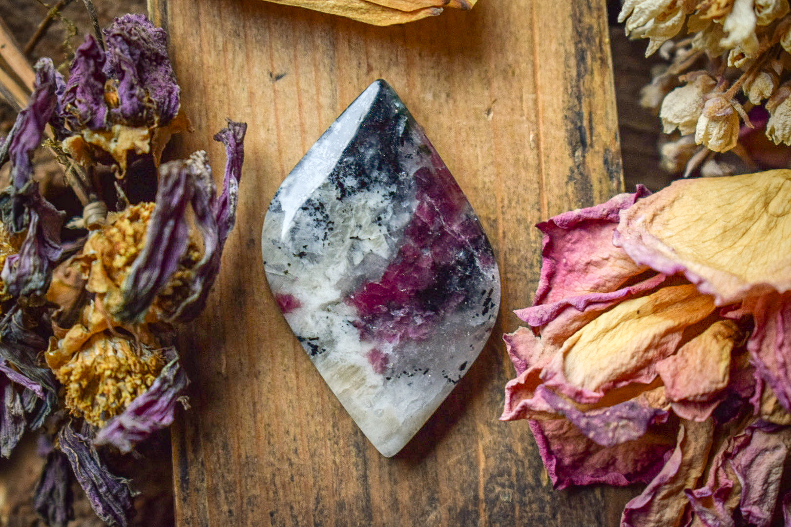 On y retrouve le rose framboise de l’Eudialyte, mêlé au noir de l’Aegirine et à des zones blanches et translucides issues du feldspath.