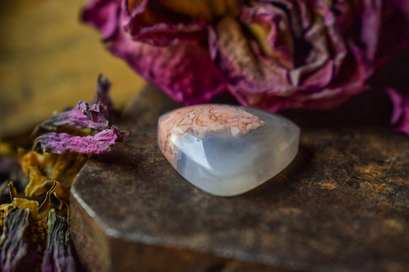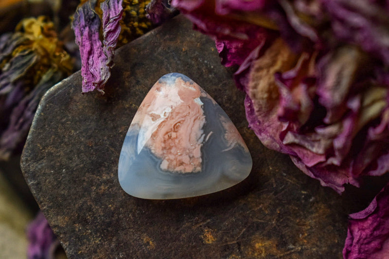 Cabochon Agate Cotton Candy aux tons bleu gris translucides.